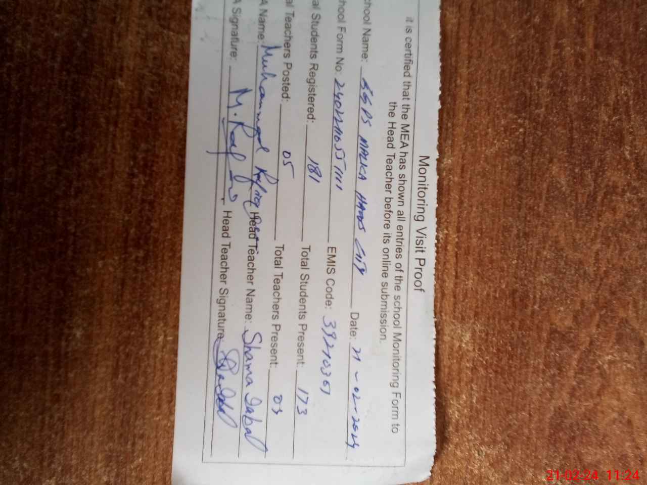 | Certified that this School was Inspected by the Undersigned MEA/DMO Today and the Information Stated Above is as Per Record. | |||||