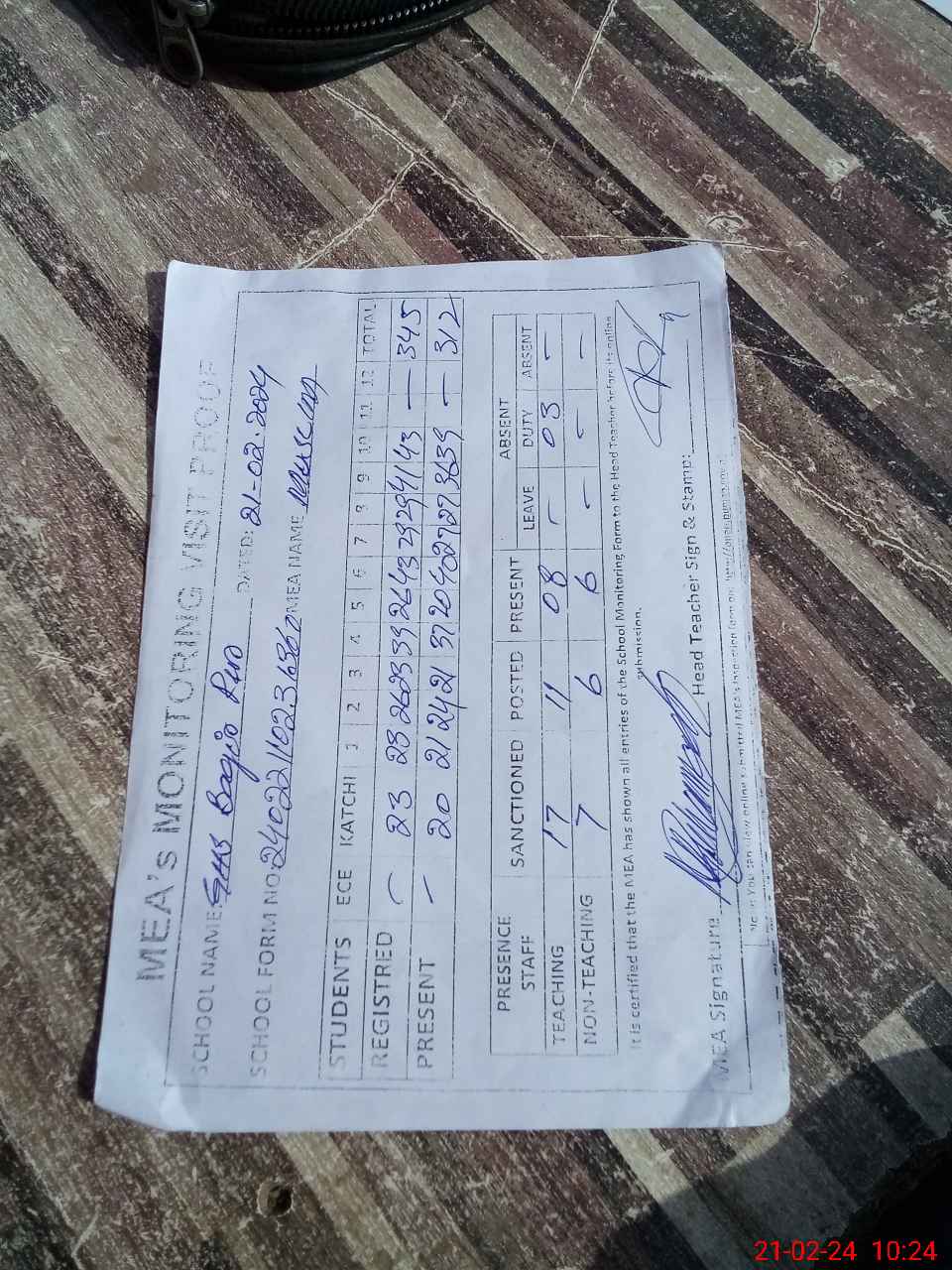 | Attendance Register | Head Teacher | MEA with School | Visit Proof |
