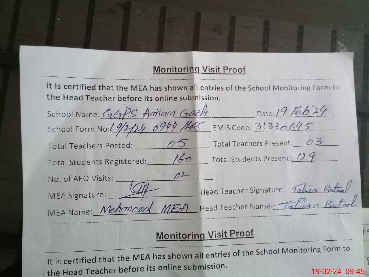 | Attendance Register | Head Teacher | MEA with School | Visit Proof |