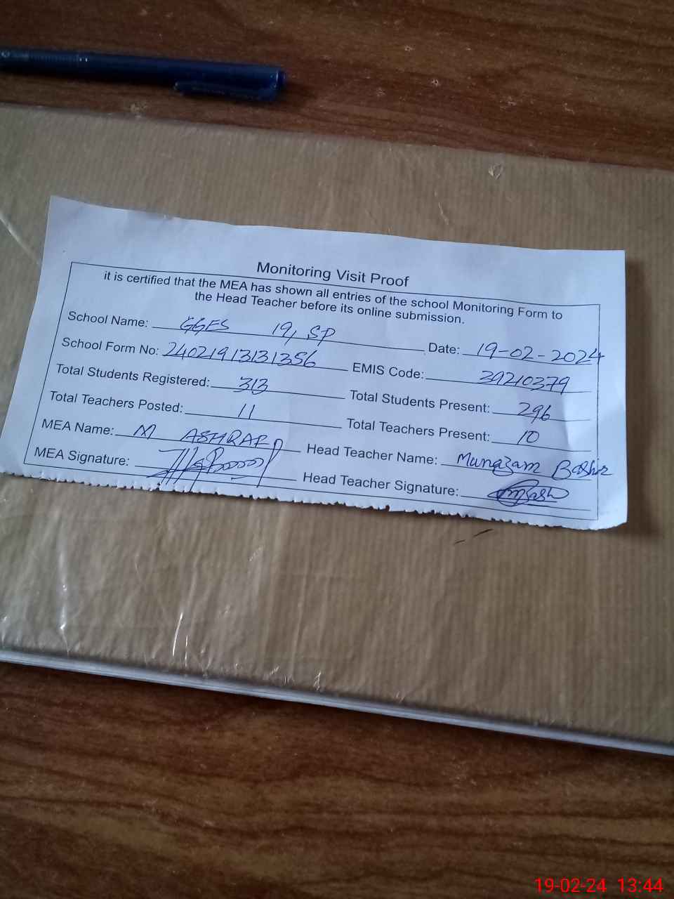 | Attendance Register | Head Teacher | MEA with School | Visit Proof |
