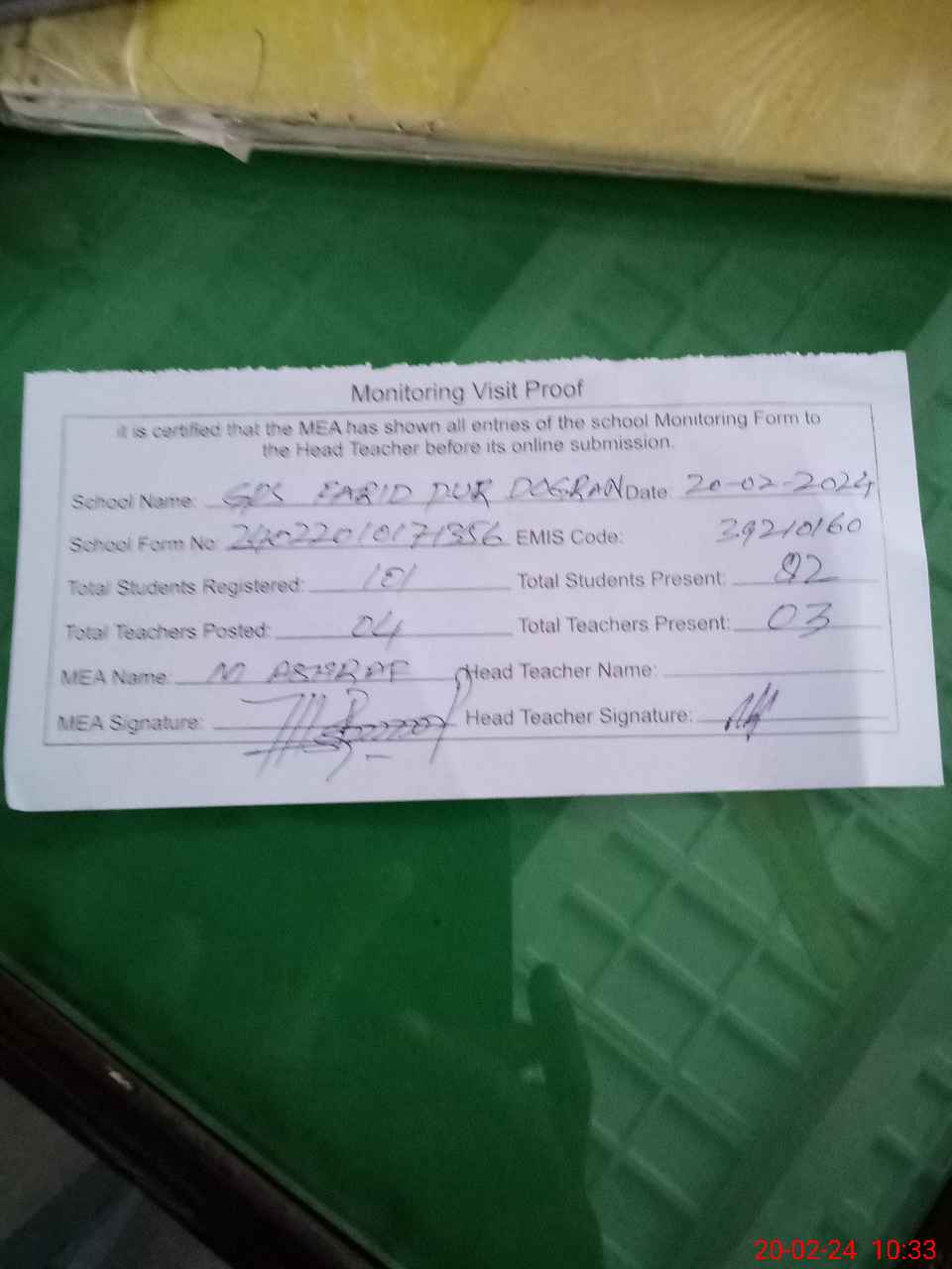 | EMIS Code: 39210160 | Name of School: GPS FARID PUR DOGRAN | |||