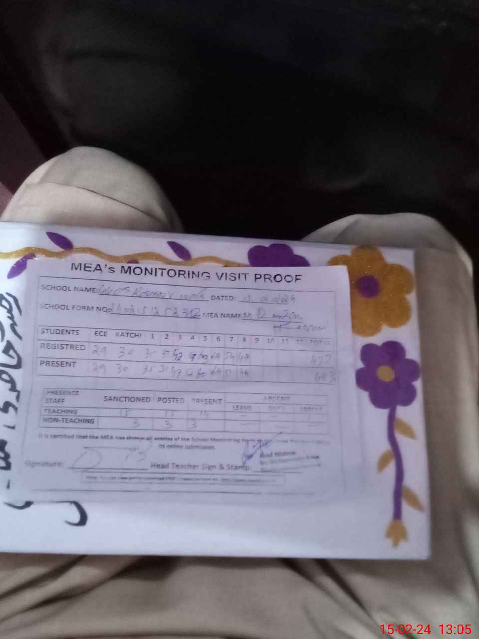 | Attendance Register | Head Teacher | MEA with School | Visit Proof |