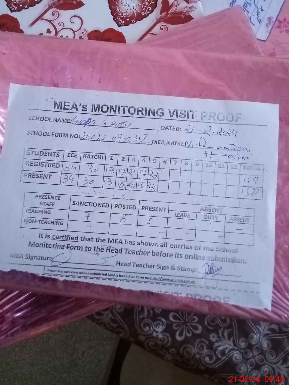 | Attendance Register | Head Teacher | MEA with School | Visit Proof |