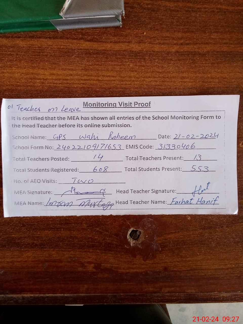 | EMIS Code: 31330406 | Name of School: GPS WAHI RAHIM | |||
