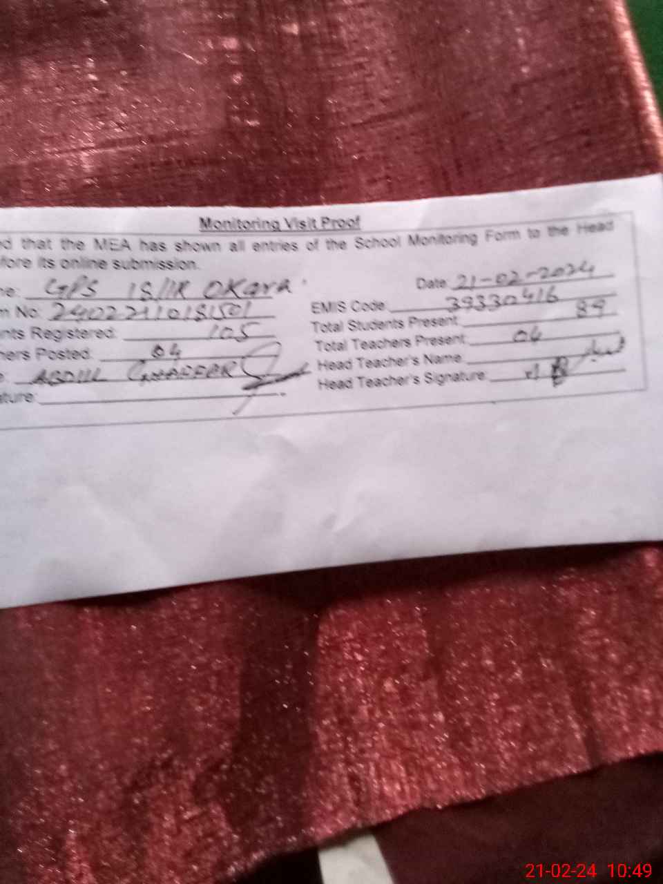 | Certified that this School was Inspected by the Undersigned MEA/DMO Today and the Information Stated Above is as Per Record. | |||||