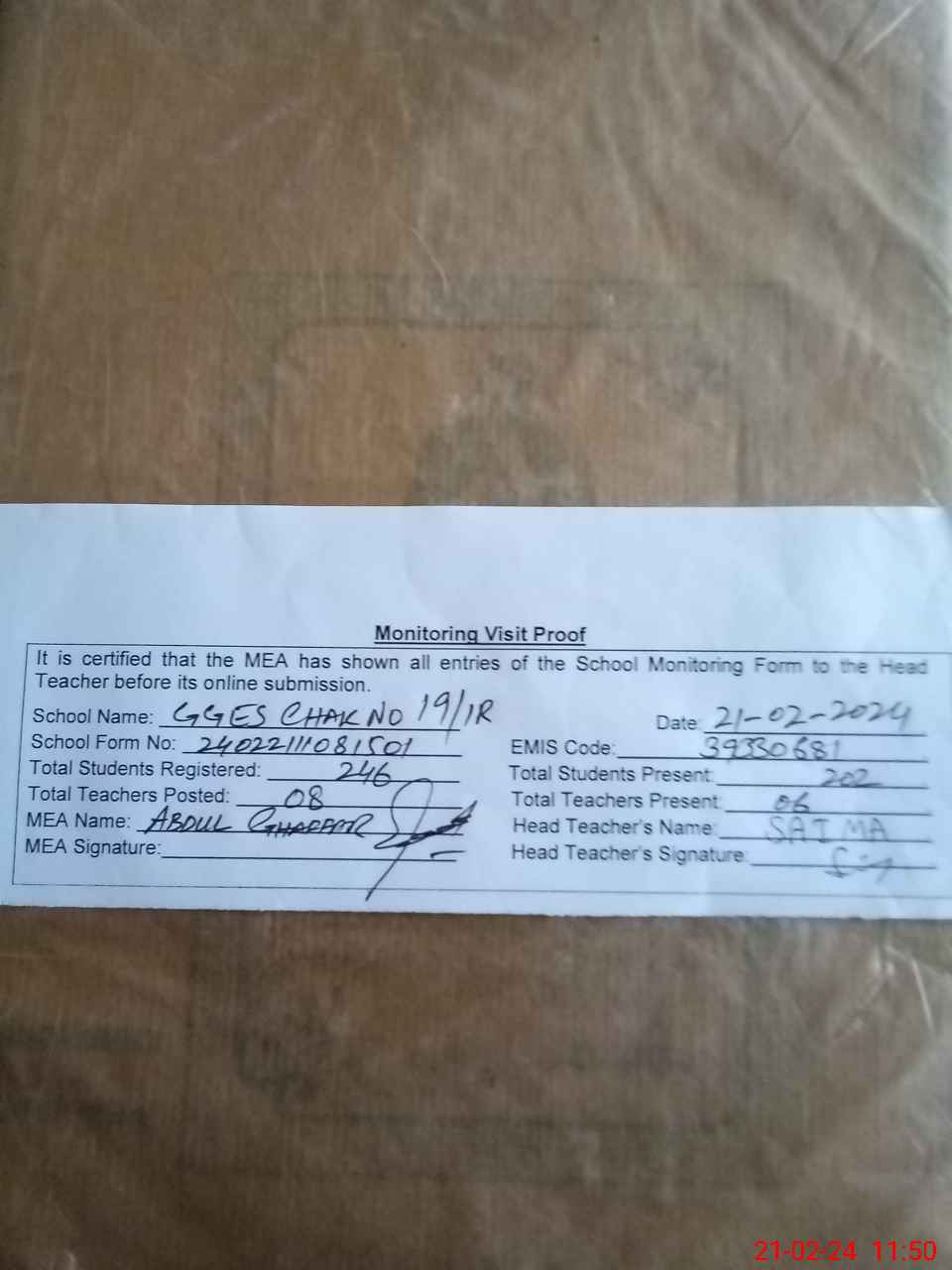 | EMIS Code: 39330681 | Name of School: GGES CHAK NO. 19/1-R | |||
