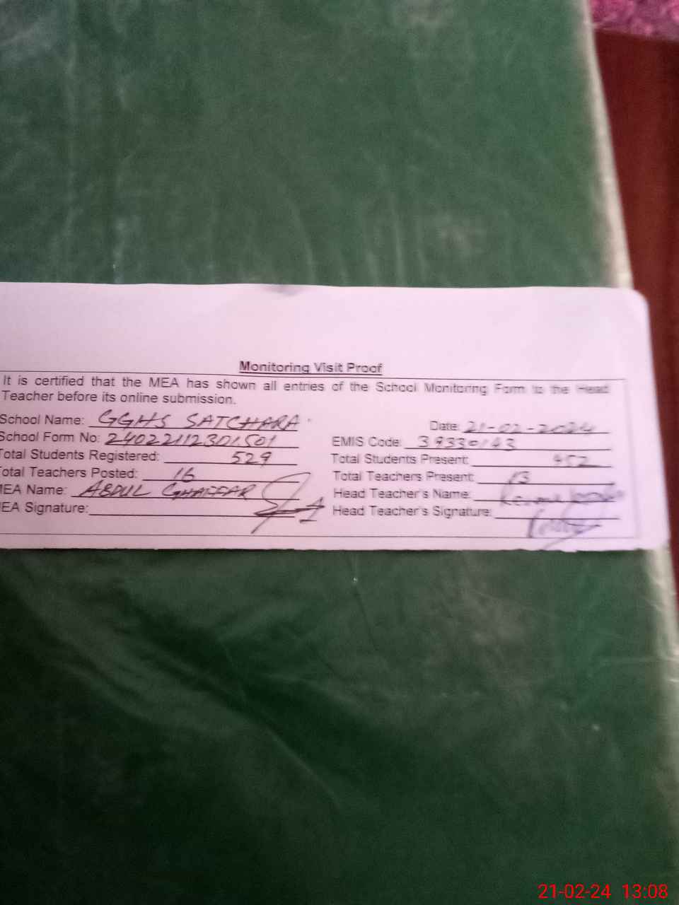| Attendance Register | Head Teacher | MEA with School | Visit Proof |