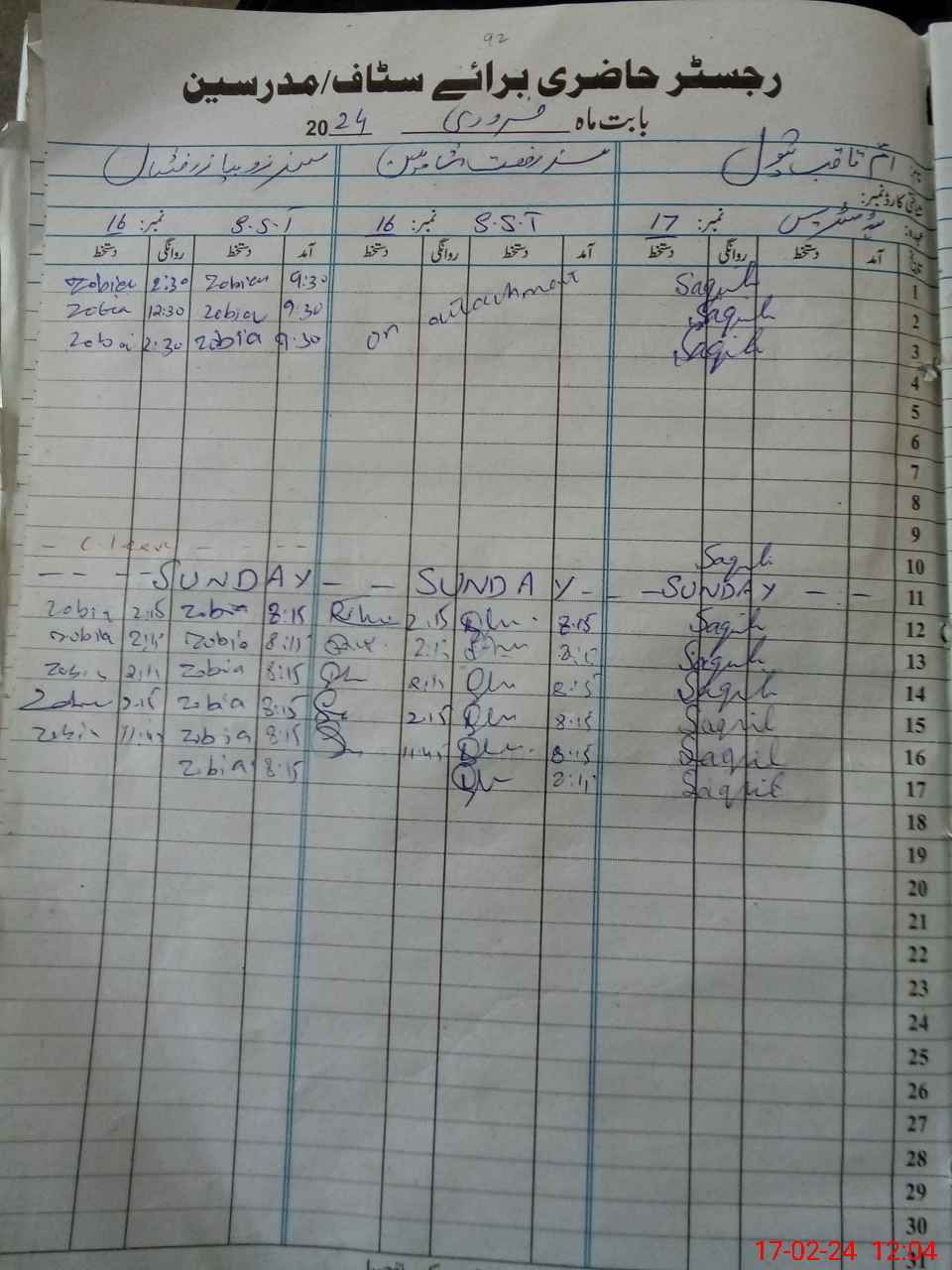 | CNIC | Full Name | Designation | R/C | Absence During Last Calender Month |