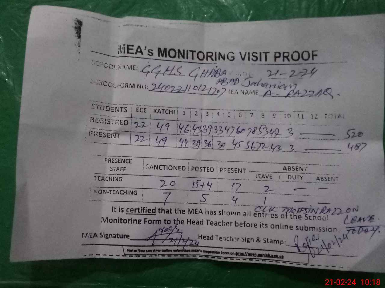 | Attendance Register | Head Teacher | MEA with School | Visit Proof |