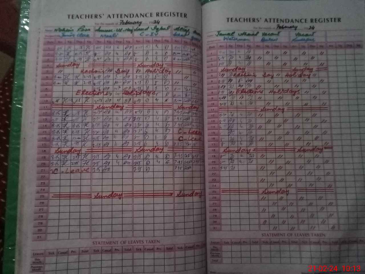| CNIC | Full Name | Designation | R/C | Absence During Last Calender Month |
