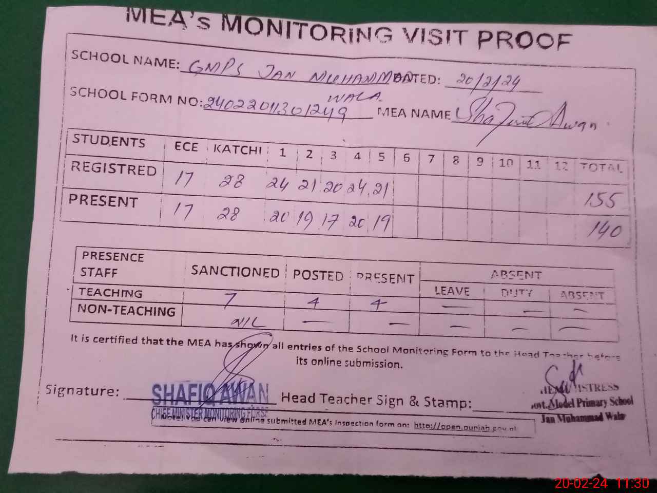 | Attendance Register | Head Teacher | MEA with School | Visit Proof |