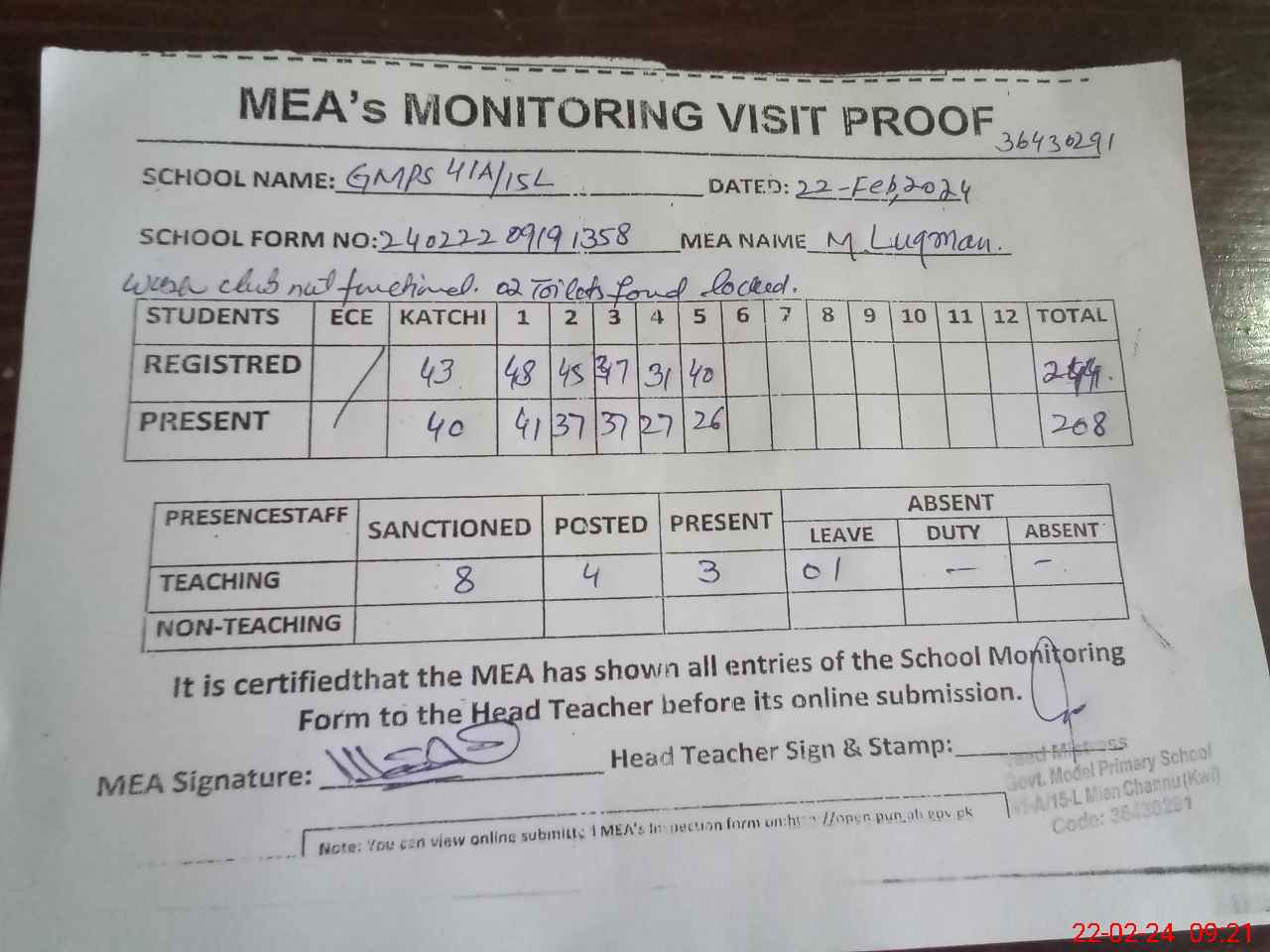 | Remarks (Use Separate Page if Required): 02 toilets found locked Litnum lesson plans not available Wash club not functional | |||||