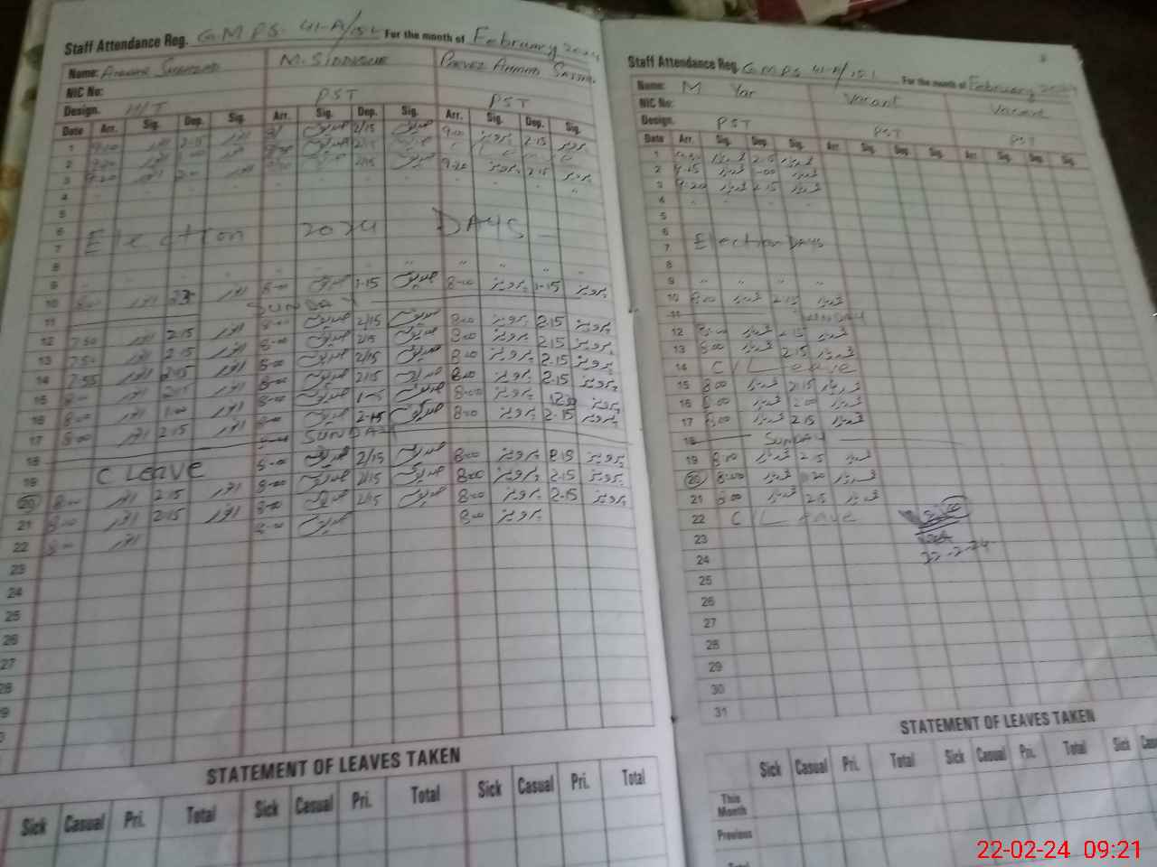 | CNIC | Full Name | Designation | R/C | Absence During Last Calender Month |