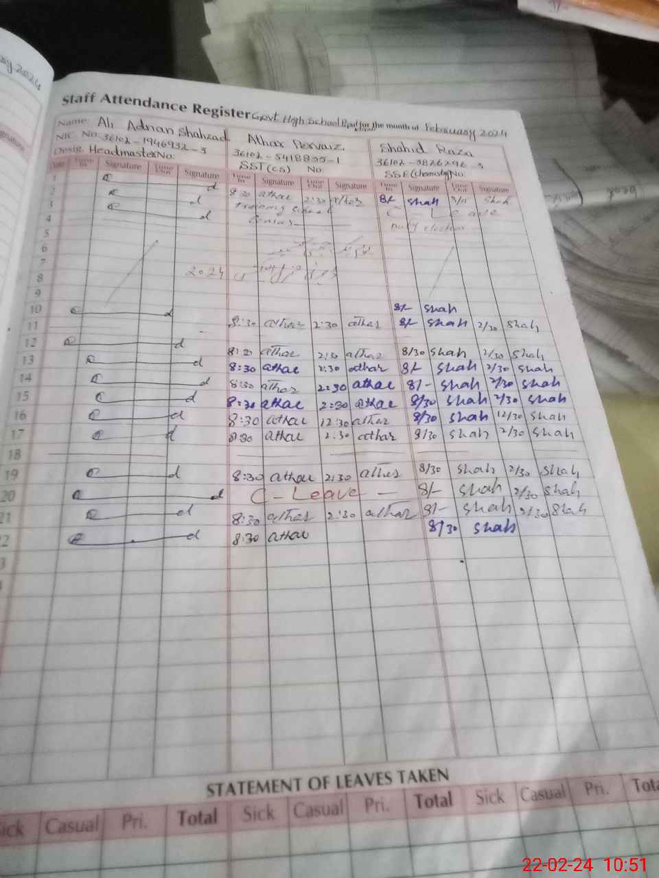 | CNIC | Full Name | Designation | R/C | Absence During Last Calender Month |