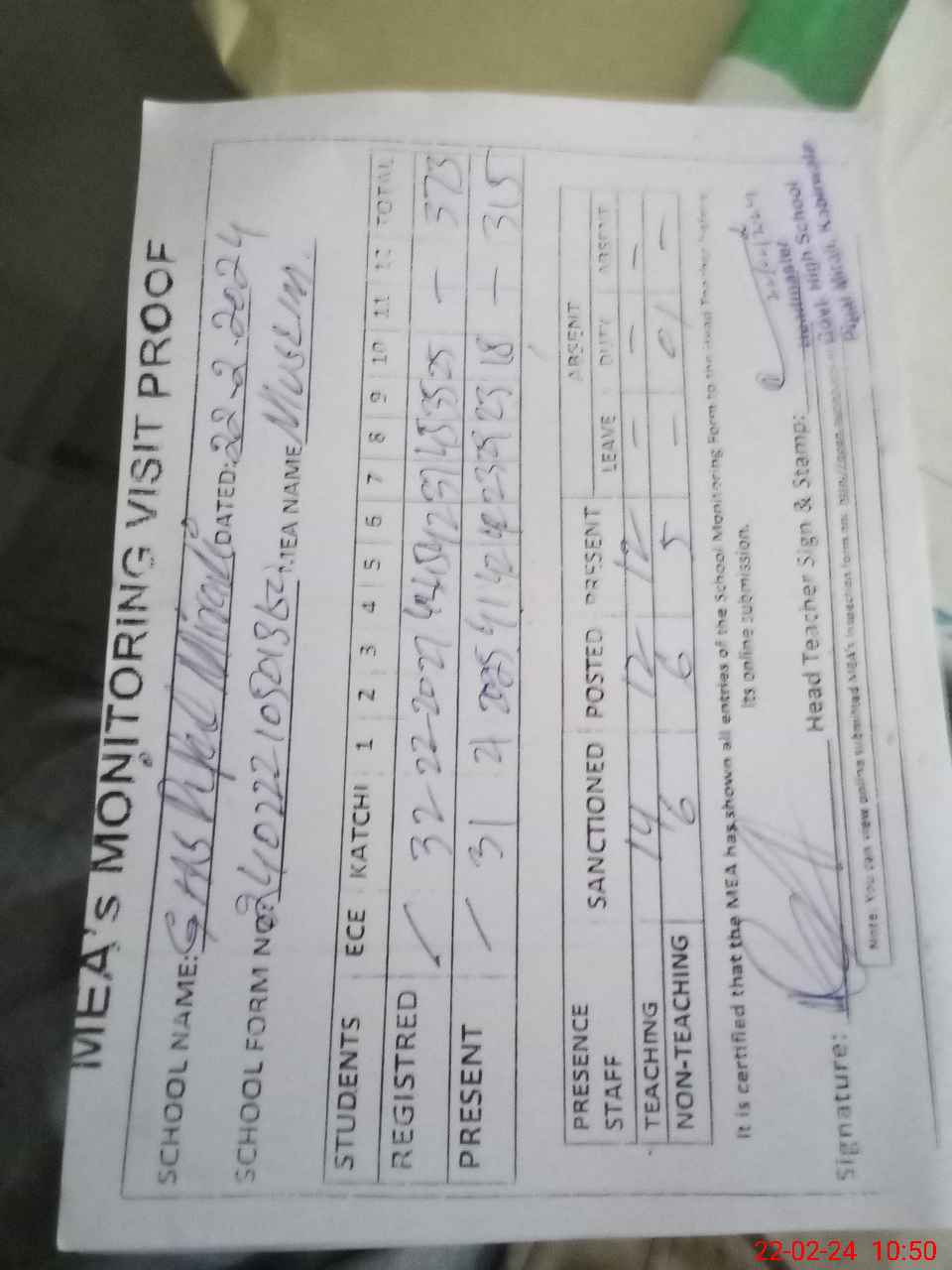 | Attendance Register | Head Teacher | MEA with School | Visit Proof |