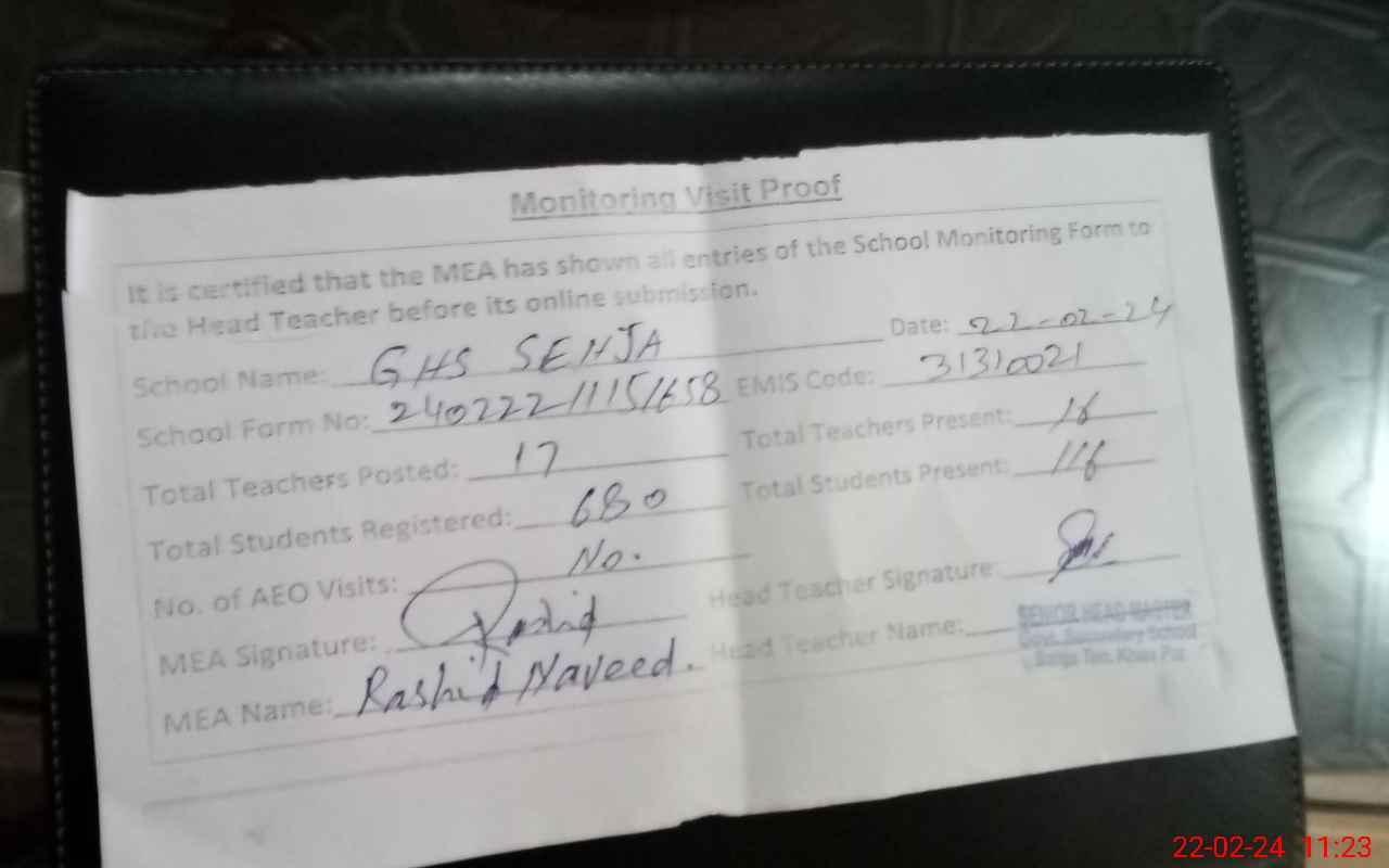 | Attendance Register | Head Teacher | MEA with School | Visit Proof |
