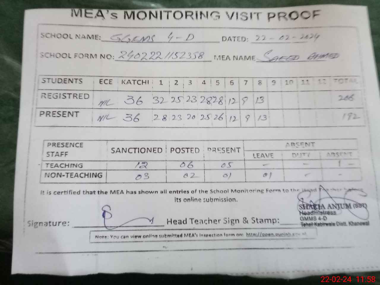 | Attendance Register | Head Teacher | MEA with School | Visit Proof |