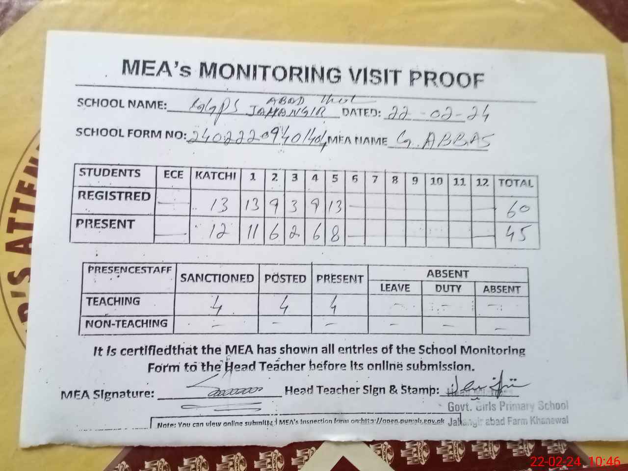 | Attendance Register | Head Teacher | MEA with School | Visit Proof |