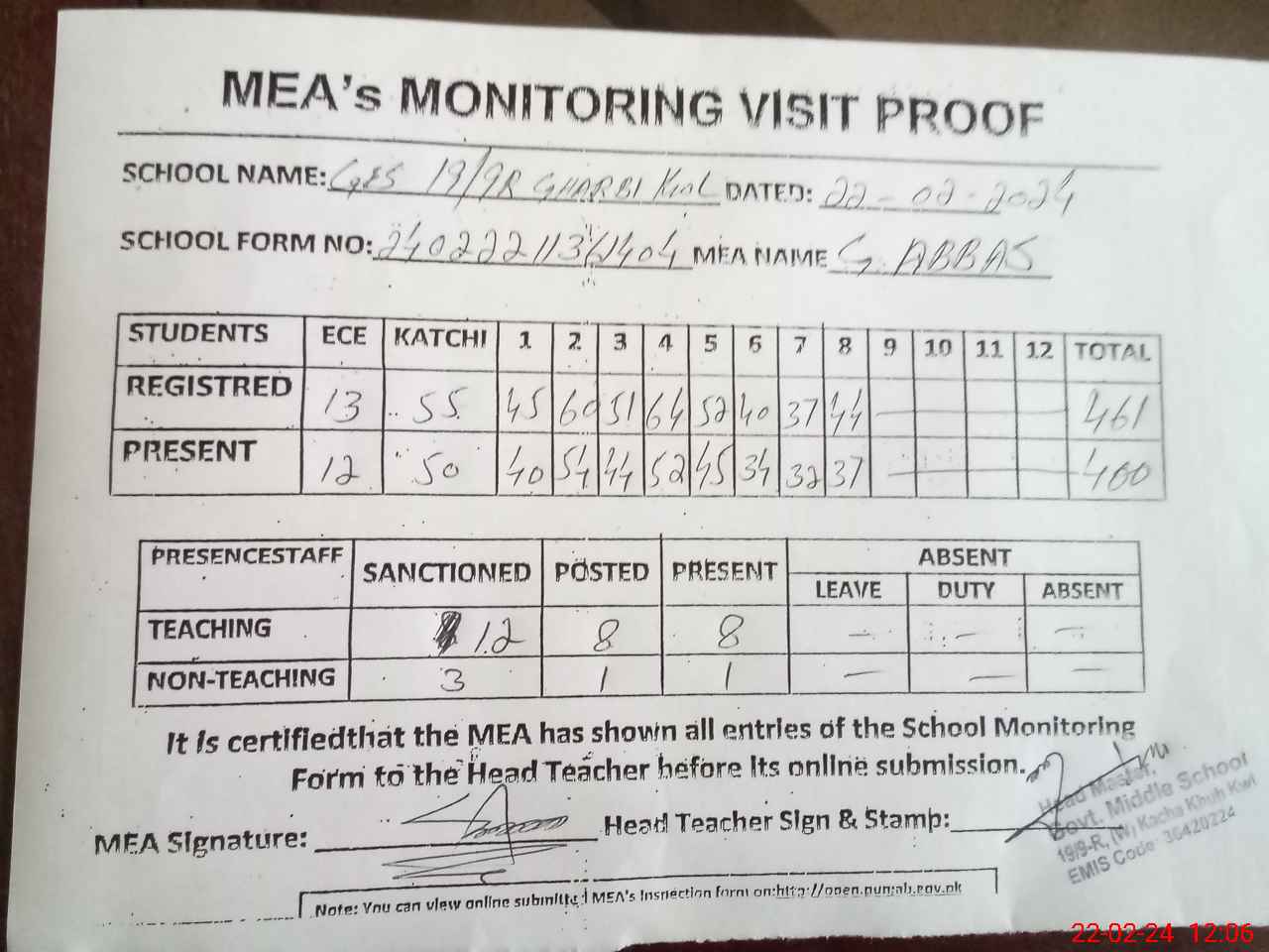 | Attendance Register | Head Teacher | MEA with School | Visit Proof |