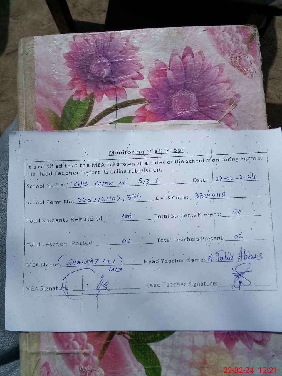 | Attendance Register | Head Teacher | MEA with School | Visit Proof |