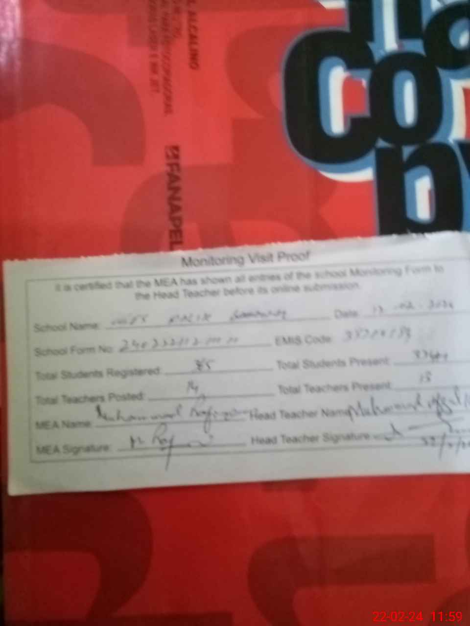 | Attendance Register | Head Teacher | MEA with School | Visit Proof |