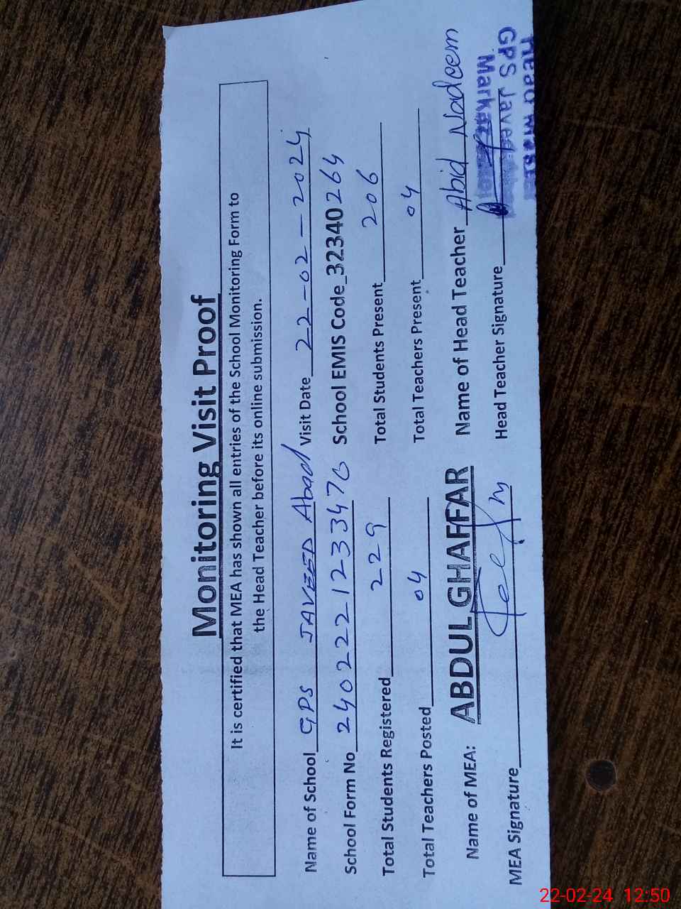 | EMIS Code: 32340264 | Name of School: GPS S JAVAID ABAD | |||