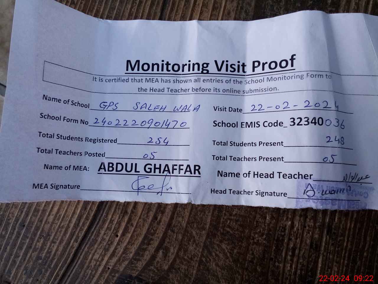 | EMIS Code: 32340036 | Name of School: GPS SALEH WALA | |||