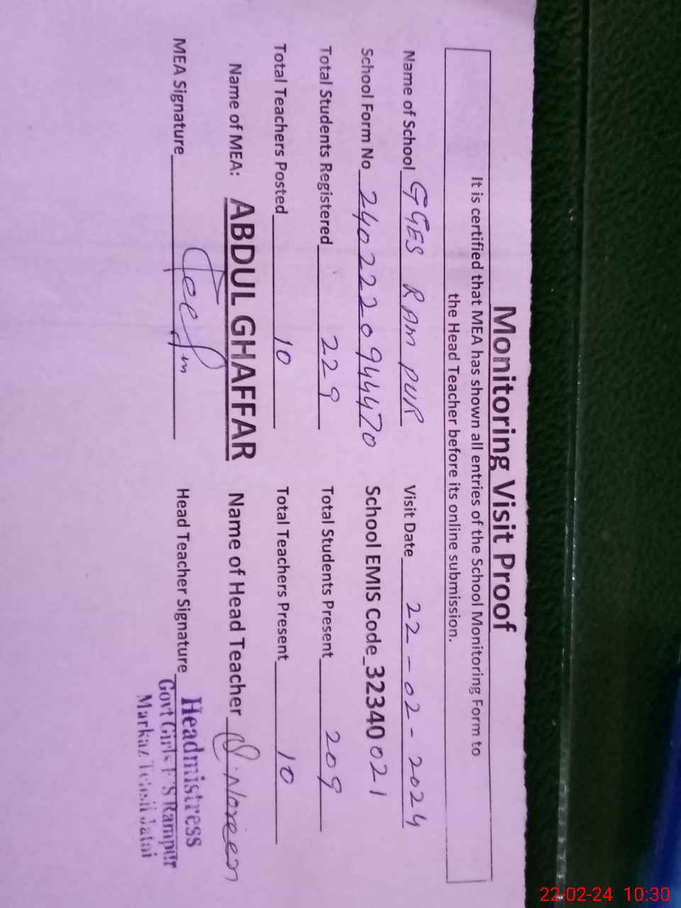| Certified that this School was Inspected by the Undersigned MEA/DMO Today and the Information Stated Above is as Per Record. | |||||