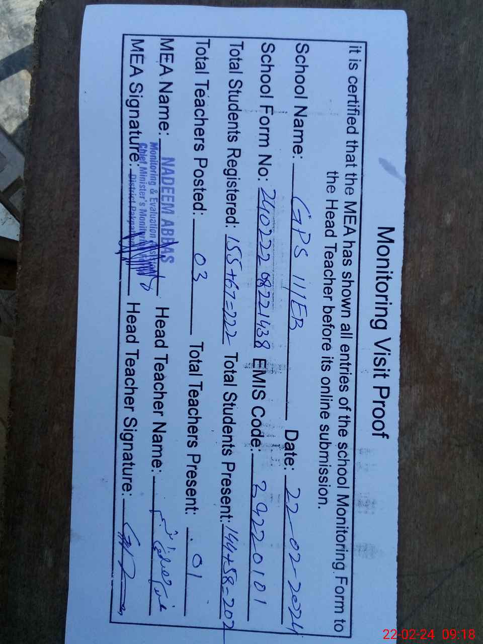 | Attendance Register | Head Teacher | MEA with School | Visit Proof |
