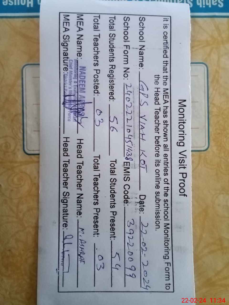 | Attendance Register | Head Teacher | MEA with School | Visit Proof |