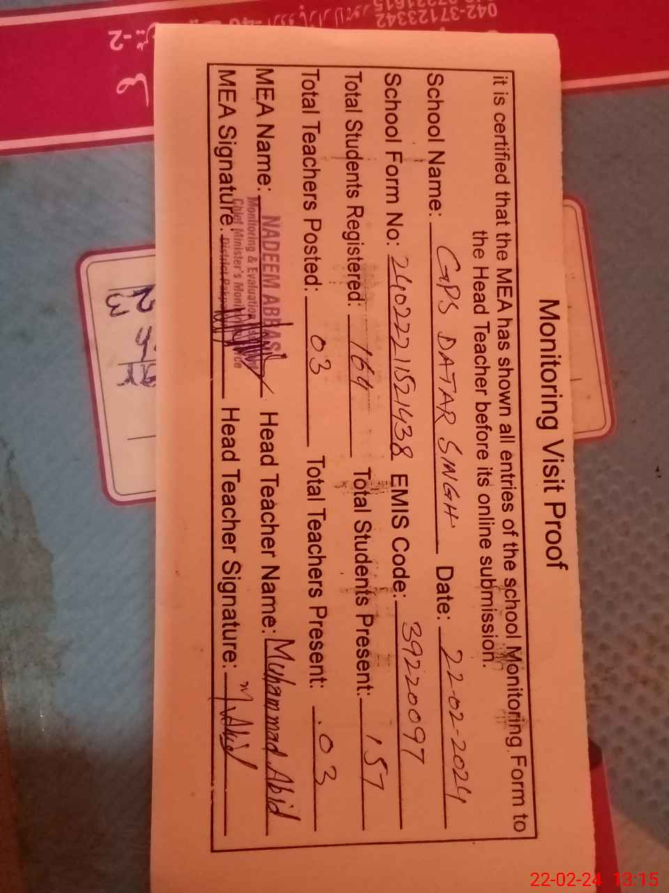 | Certified that this School was Inspected by the Undersigned MEA/DMO Today and the Information Stated Above is as Per Record. | |||||