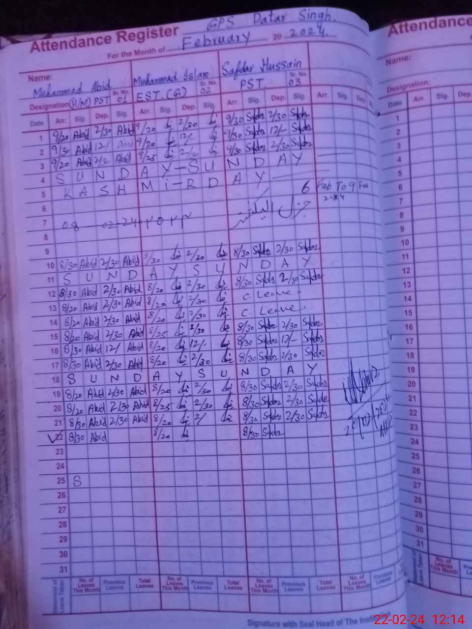 | CNIC | Full Name | Designation | R/C | Absence During Last Calender Month |