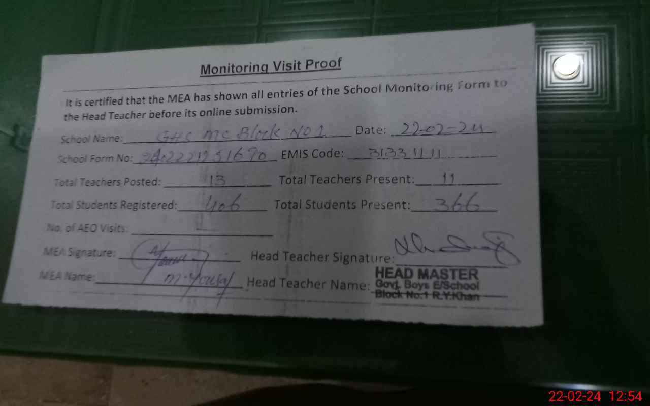 | EMIS Code: 31331111 | Name of School: GHS MC BLOCK NO. 1 | |||