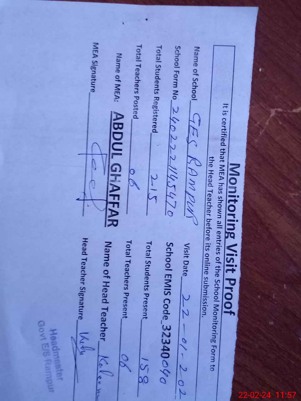 | Attendance Register | Head Teacher | MEA with School | Visit Proof |
