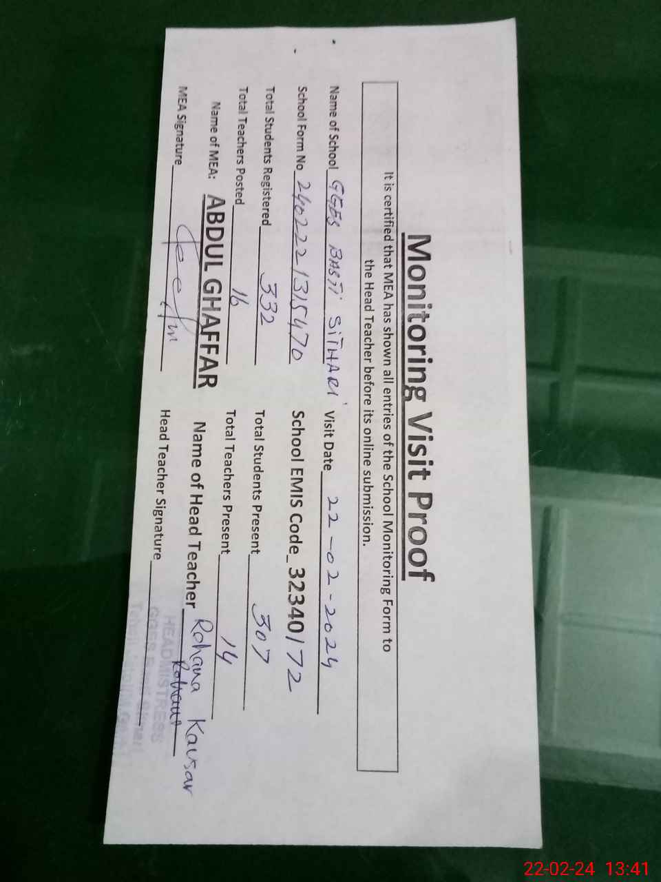 | Attendance Register | Head Teacher | MEA with School | Visit Proof |