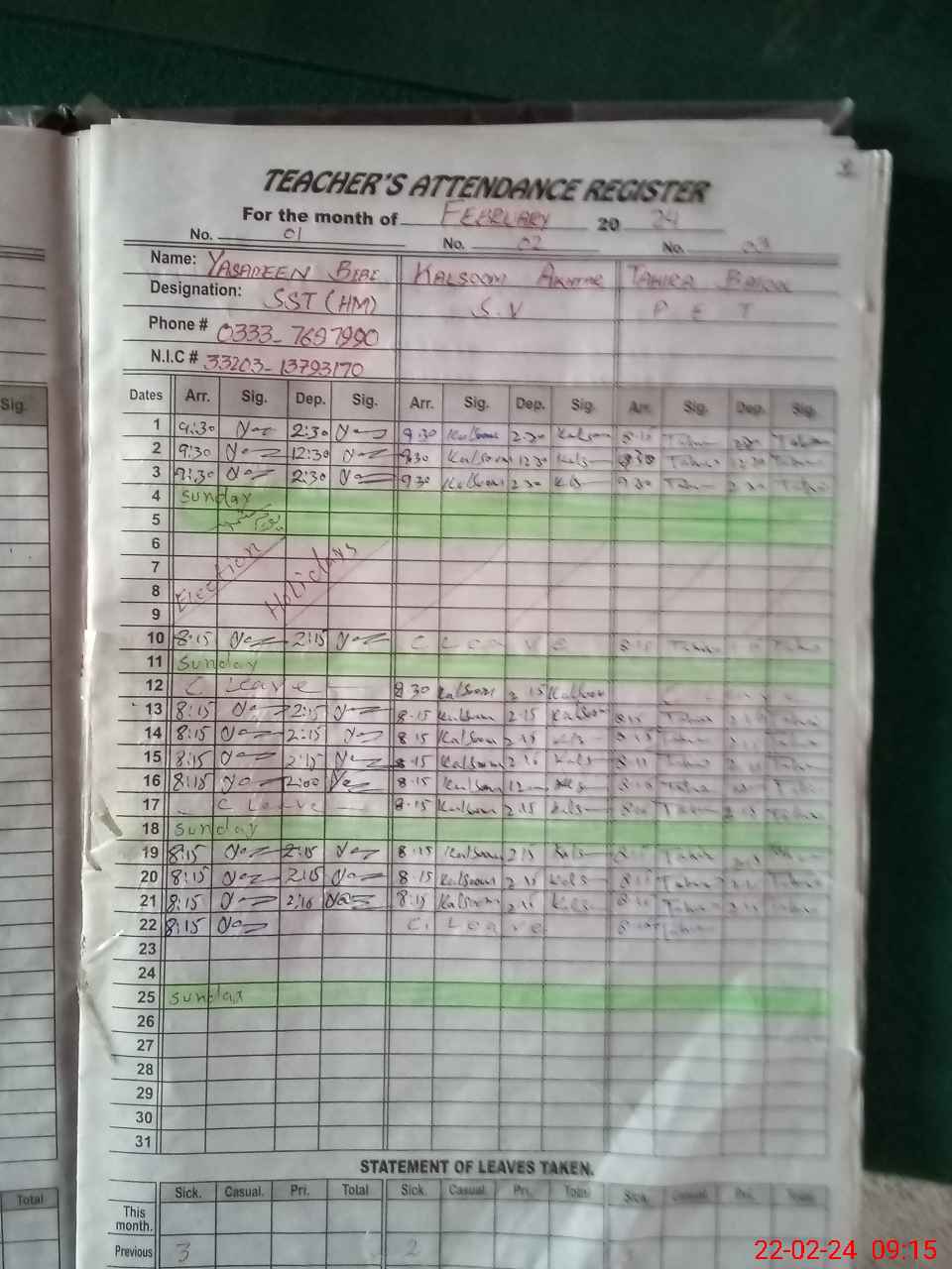 | CNIC | Full Name | Designation | R/C | Absence During Last Calender Month |