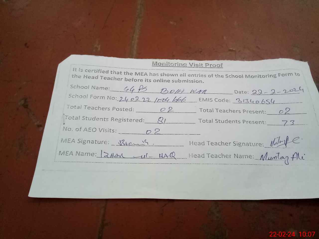| Certified that this School was Inspected by the Undersigned MEA/DMO Today and the Information Stated Above is as Per Record. | |||||