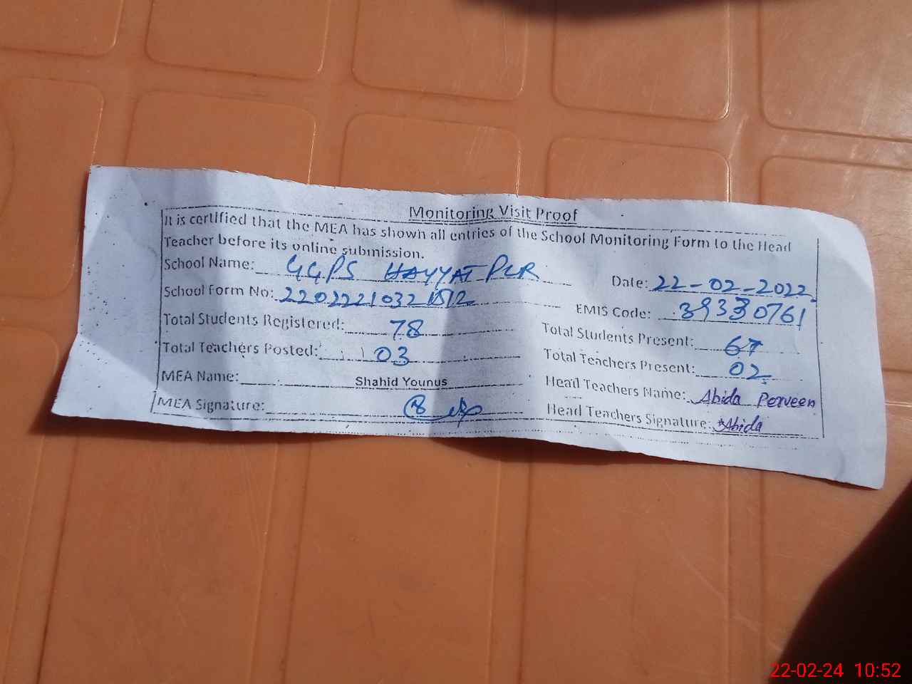 | EMIS Code: 39330761 | Name of School: GGPS HAYAT PUR | |||