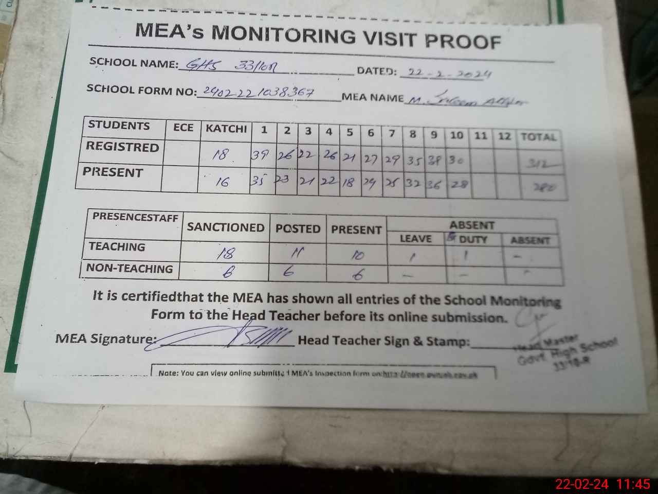 | Attendance Register | Head Teacher | MEA with School | Visit Proof |