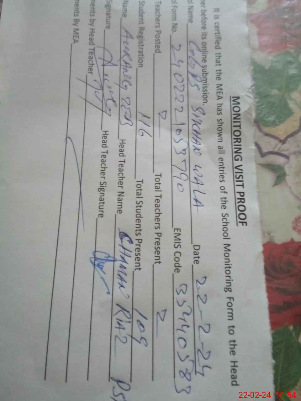 | Attendance Register | Head Teacher | MEA with School | Visit Proof |