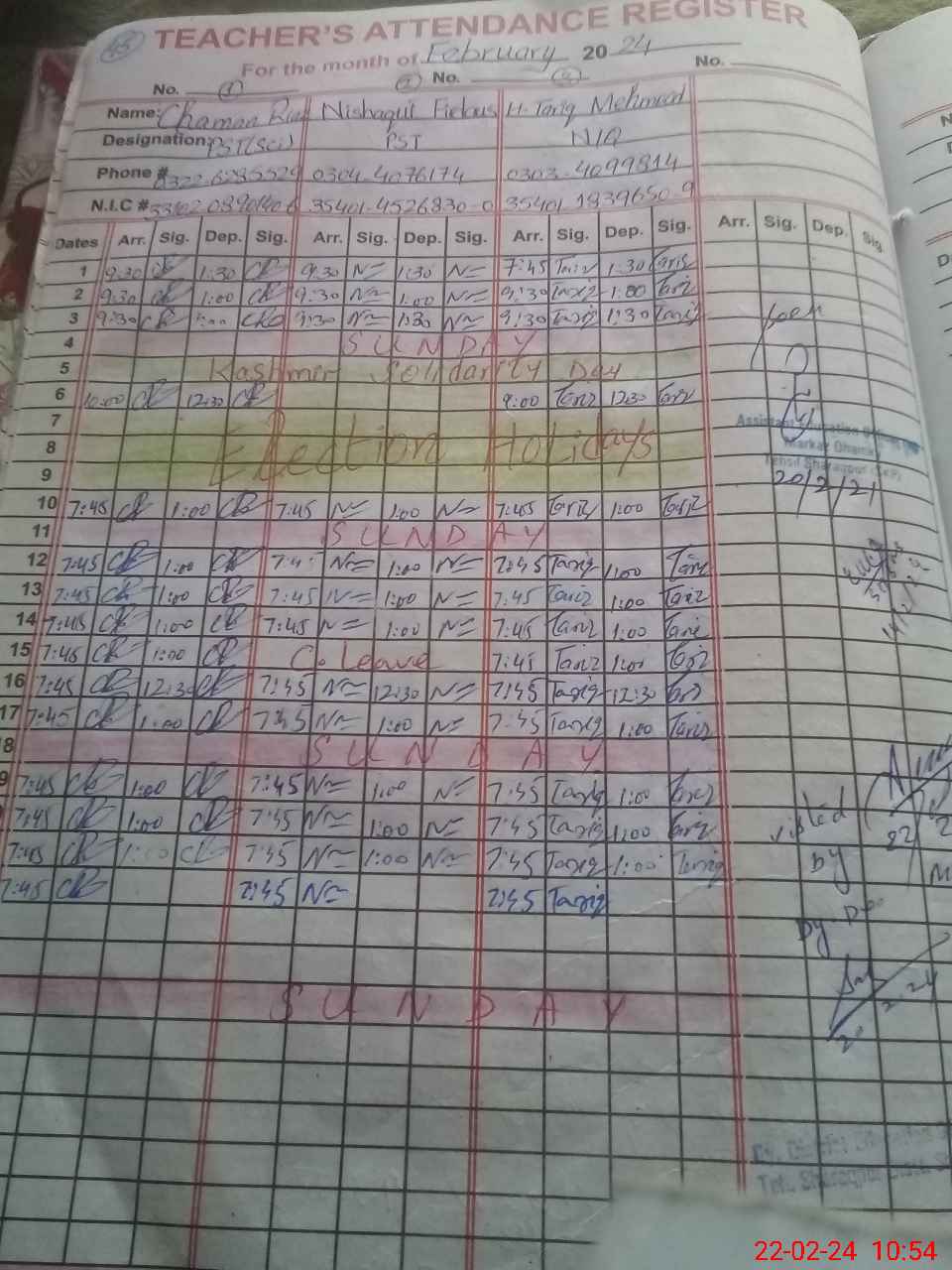 | CNIC | Full Name | Designation | R/C | Absence during last cal. month |