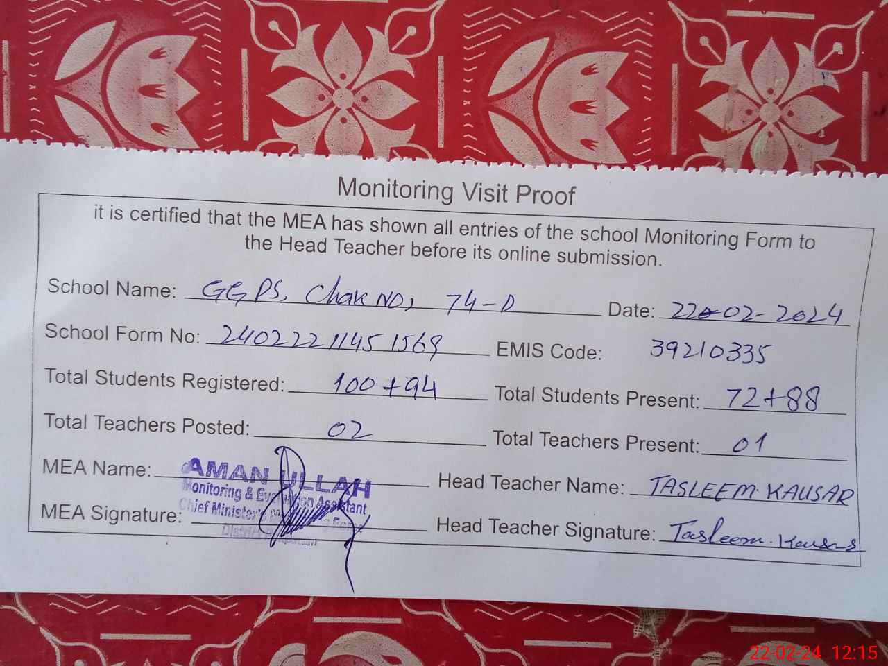 | EMIS Code: 39210335 | Name of School: GGPS CHAK 74/D | |||