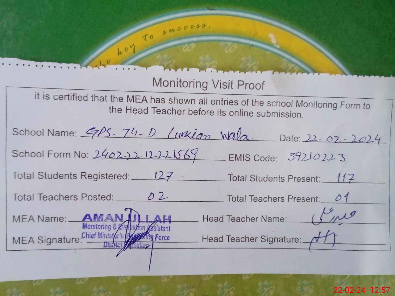 | EMIS Code: 39210223 | Name of School: GPS 74 D LURKIAN WALA | |||