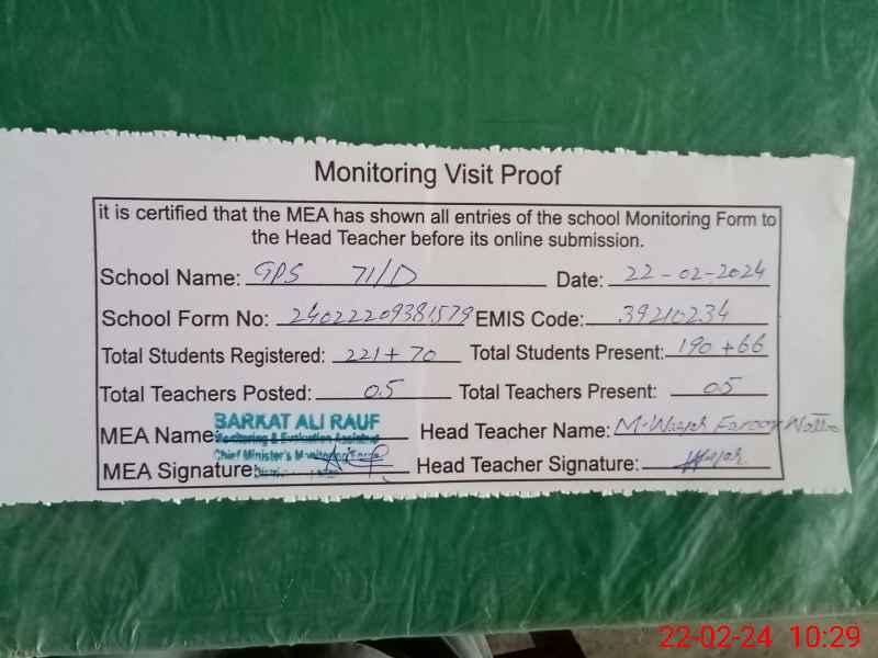 | EMIS Code: 39210234 | Name of School: GPS CHAK NO. 71 D | |||