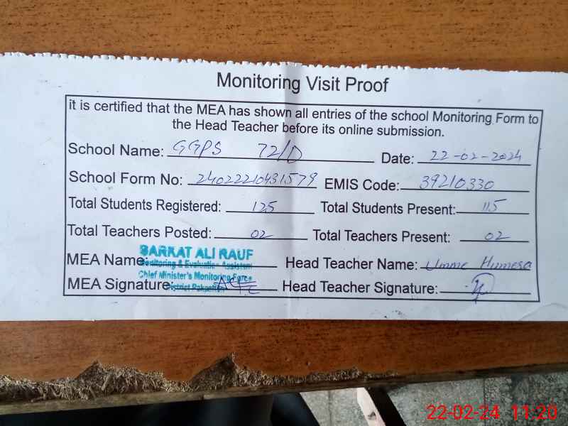 | EMIS Code: 39210330 | Name of School: GGPS CHAK NO.72 D | |||