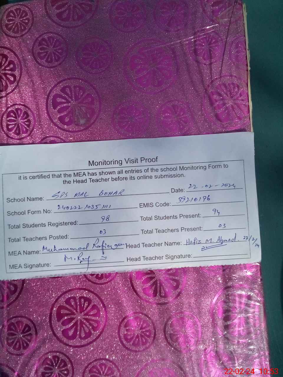 | EMIS Code: 39210196 | Name of School: GPS MAL BOHAR PO PAKPATTAN | |||