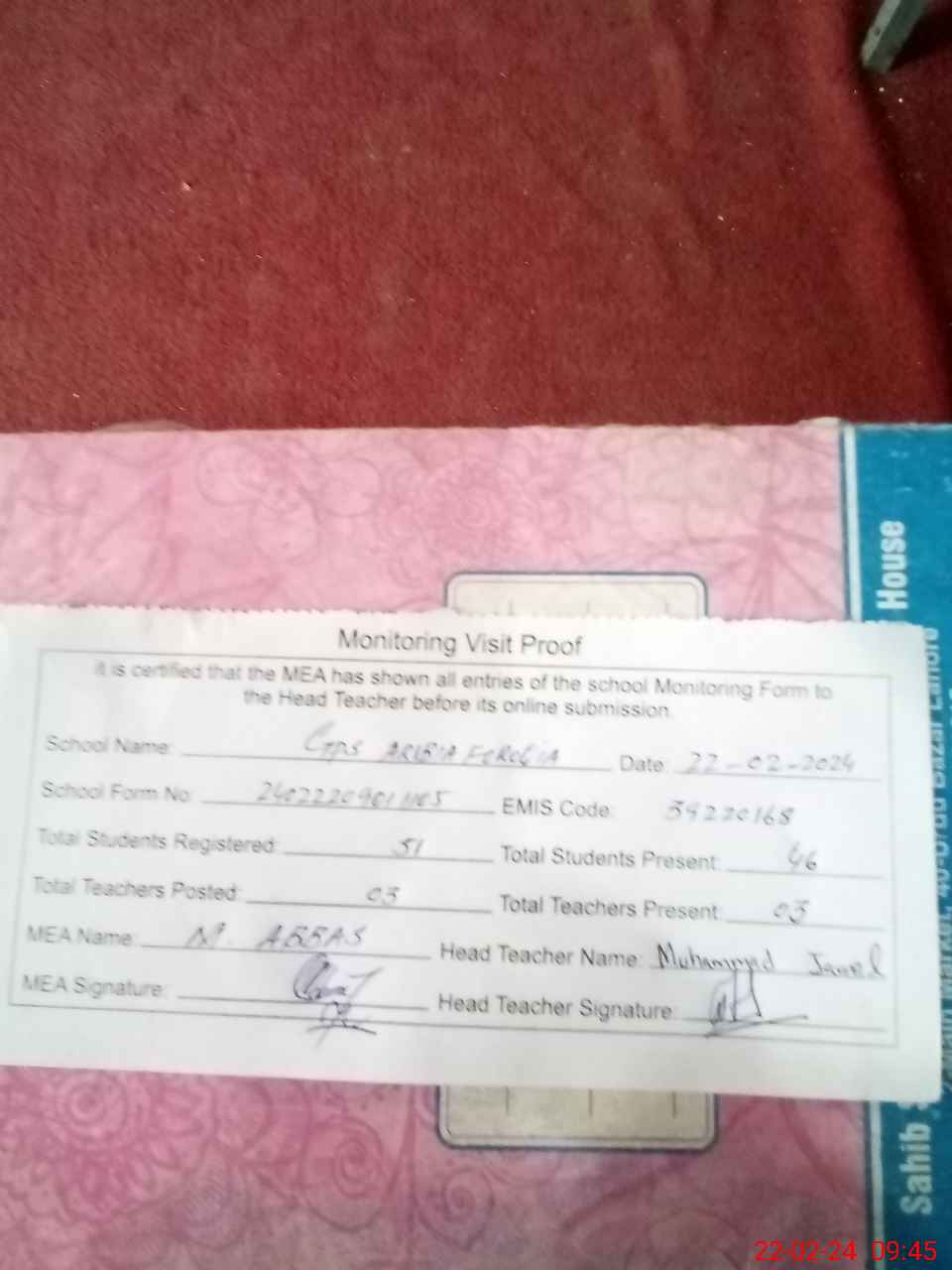 | EMIS Code: 39220168 | Name of School: GPS ARABIA FAROOQIA ARIFWALA J BLOCK | |||