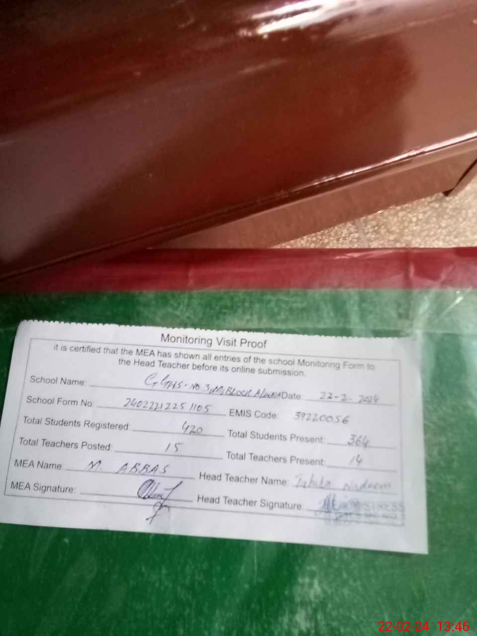 | Certified that this School was Inspected by the Undersigned MEA/DMO Today and the Information Stated Above is as Per Record. | |||||