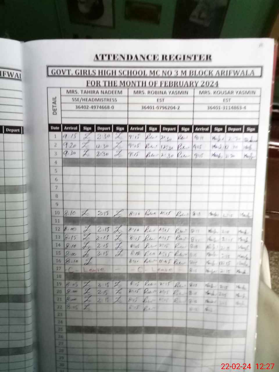 | CNIC | Full Name | Designation | R/C | Absence During Last Calender Month |