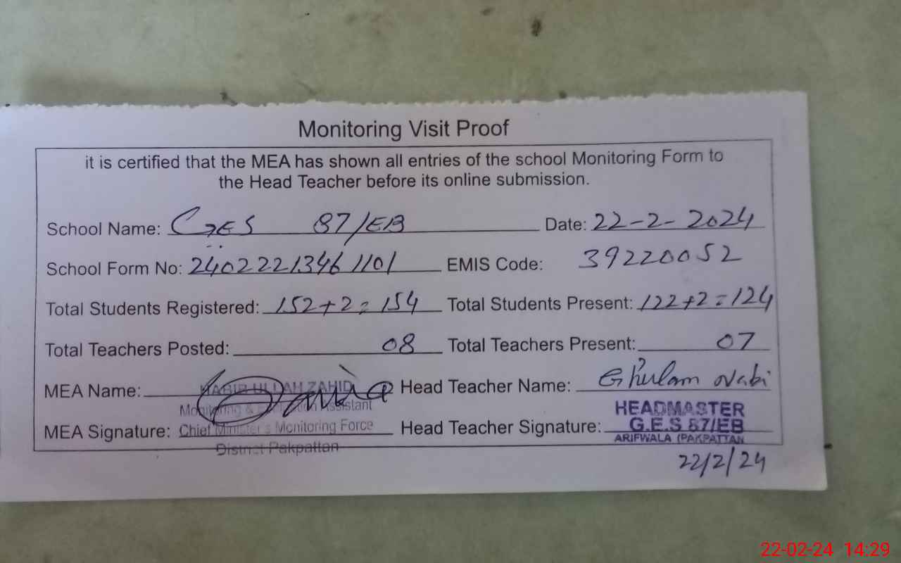 | EMIS Code: 39220052 | Name of School: GES 87 EB ARIFWALA | |||